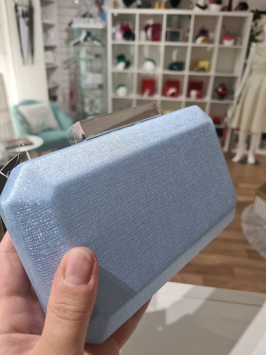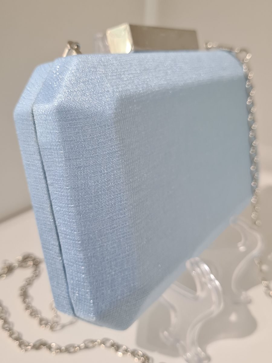 Light blue clutch bag with silver clasp and removable shoulder chain /strap