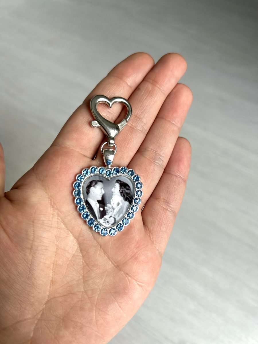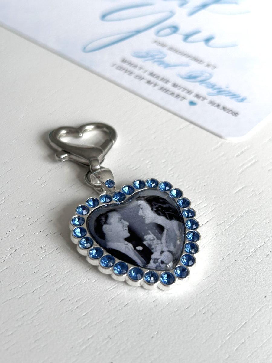 Incorporate loved ones who are no longer with you in your wedding with this beautiful blue rhinestone encrusted heart shaped memorial wedding bouquet photo charm.