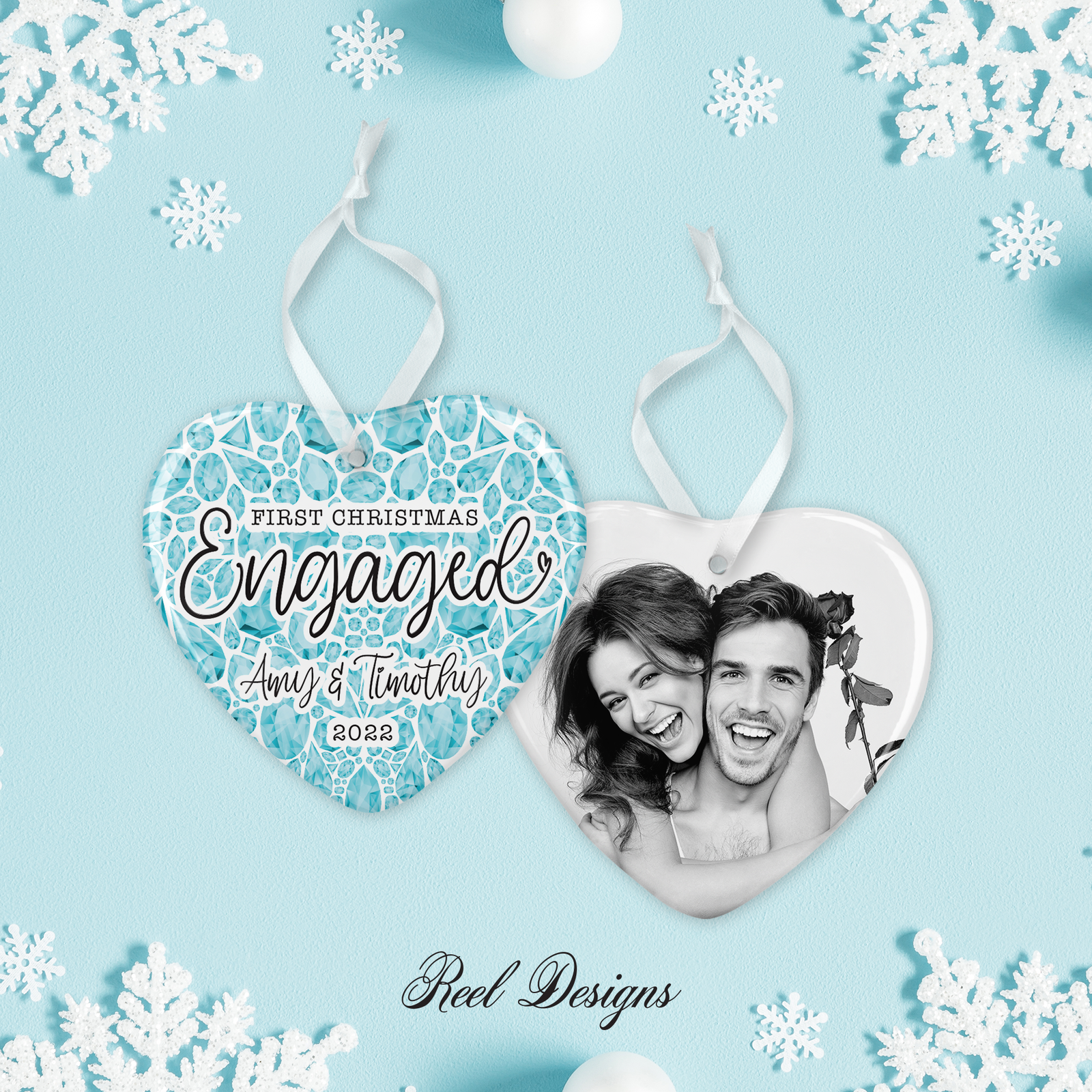 Personalised First Christmas Engaged Ceramic Love Heart Engagement Photo Keepsake Ornament