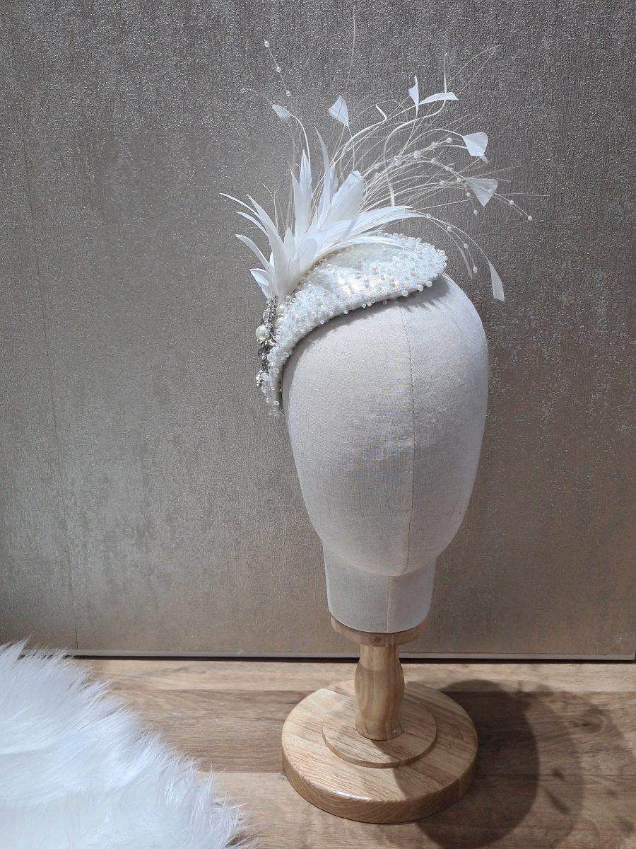 Beaded ivory teardrop headpiece with feathers and pearl detail