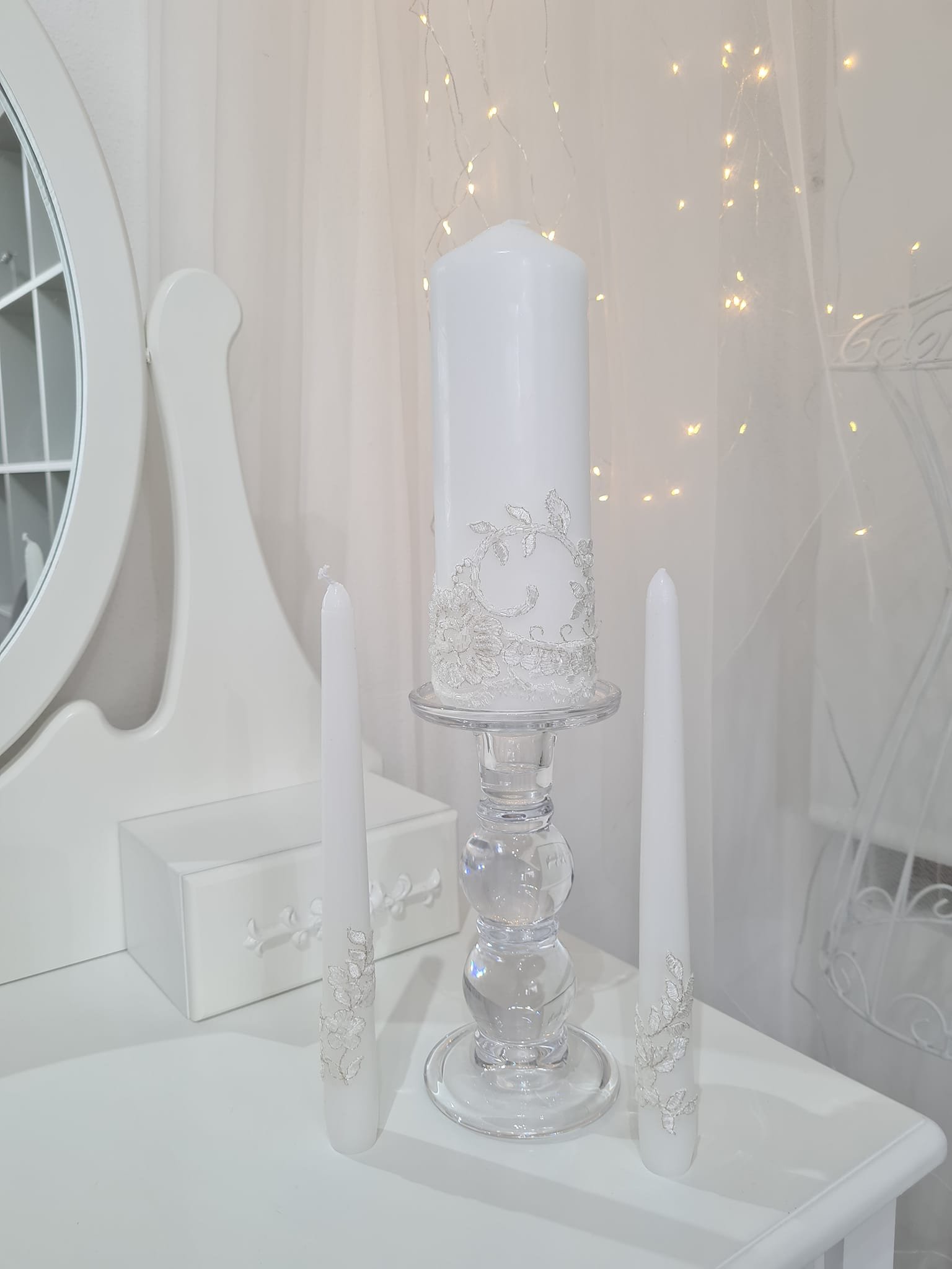 White Unscented Unity Candle Set with floral lace embellishment.