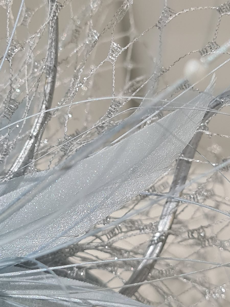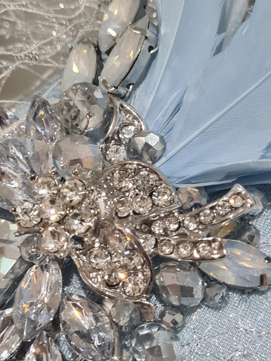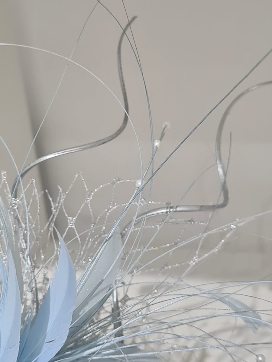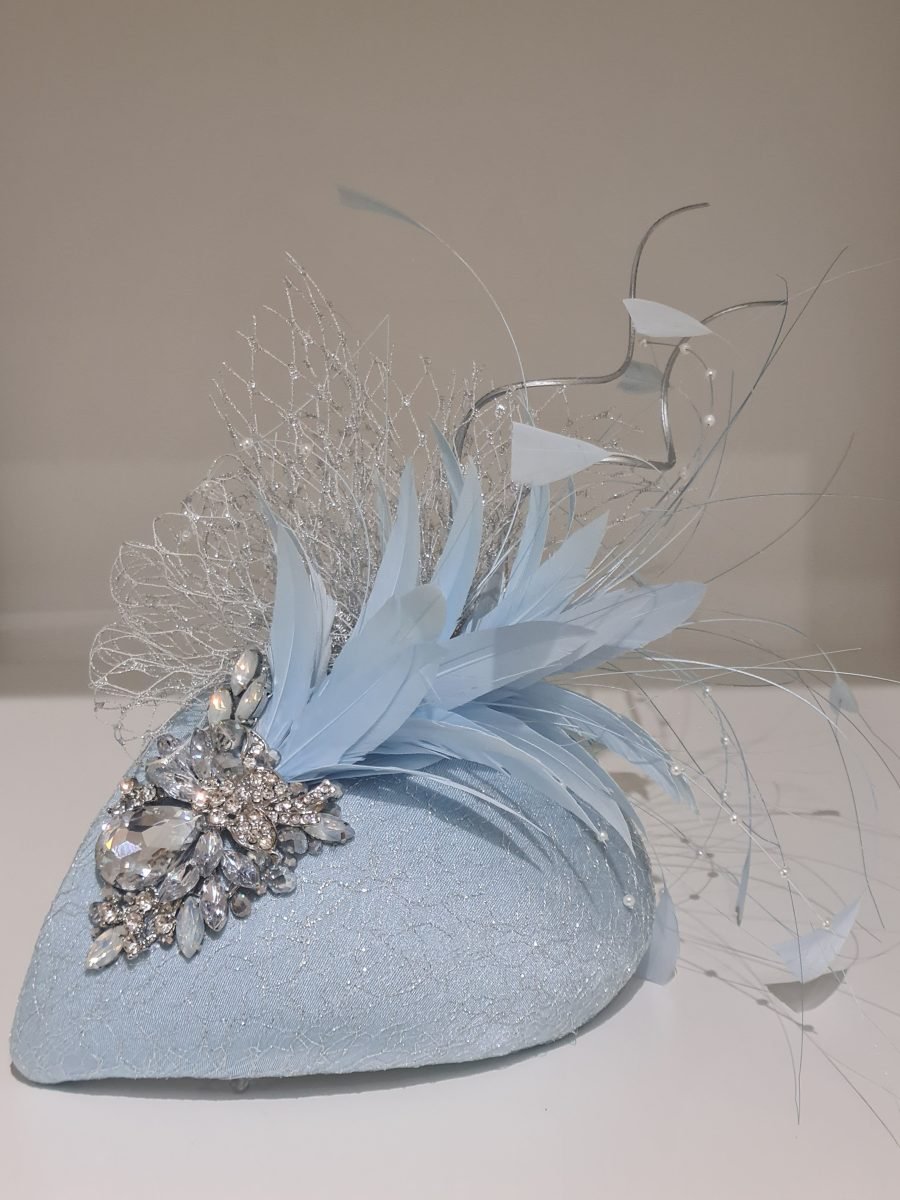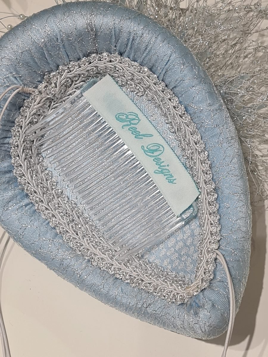 Light blue headpiece with blue feathers, silver quills, netting bow and silver rhinestone embellishment