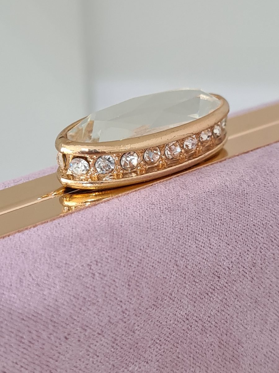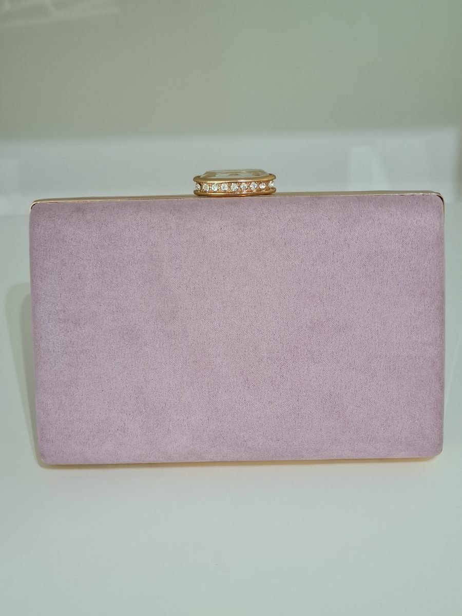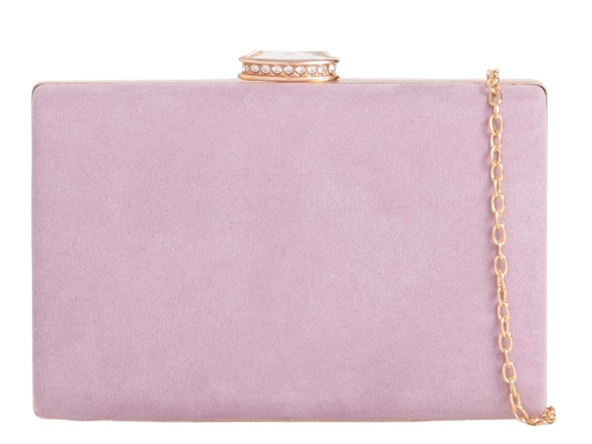Lilac suede effect evening bag with gold trim, rhinestone clasp and removable gold chain shoulder strap