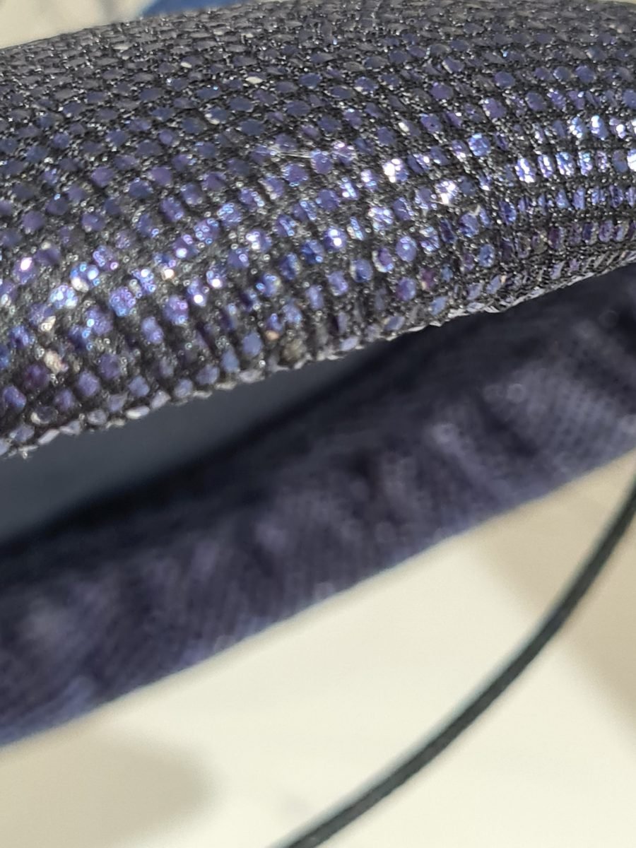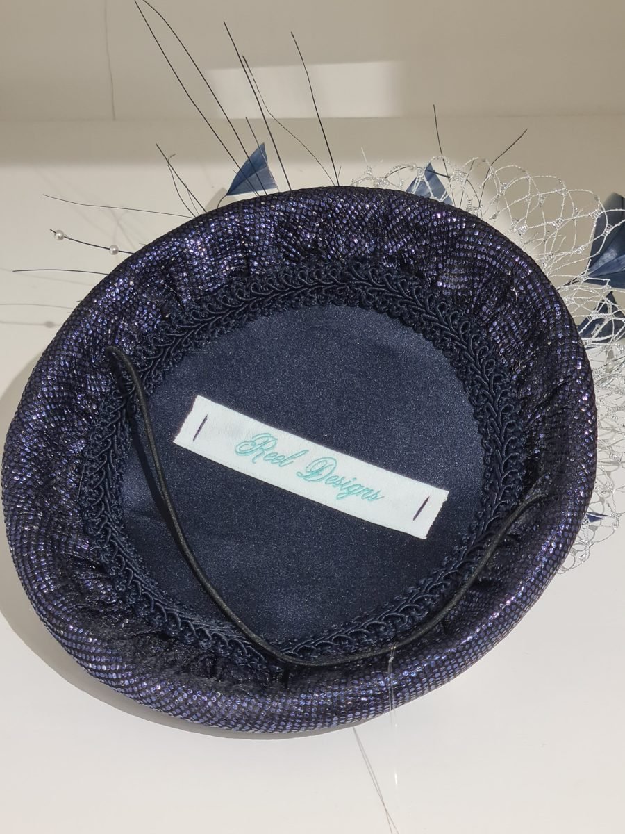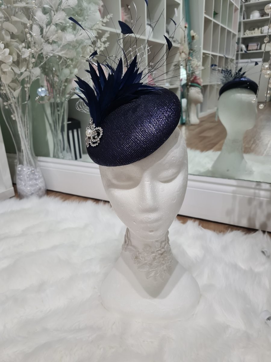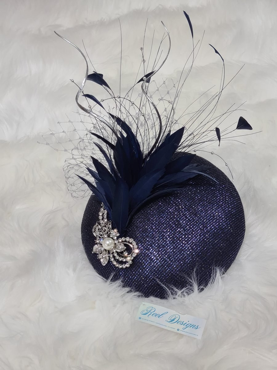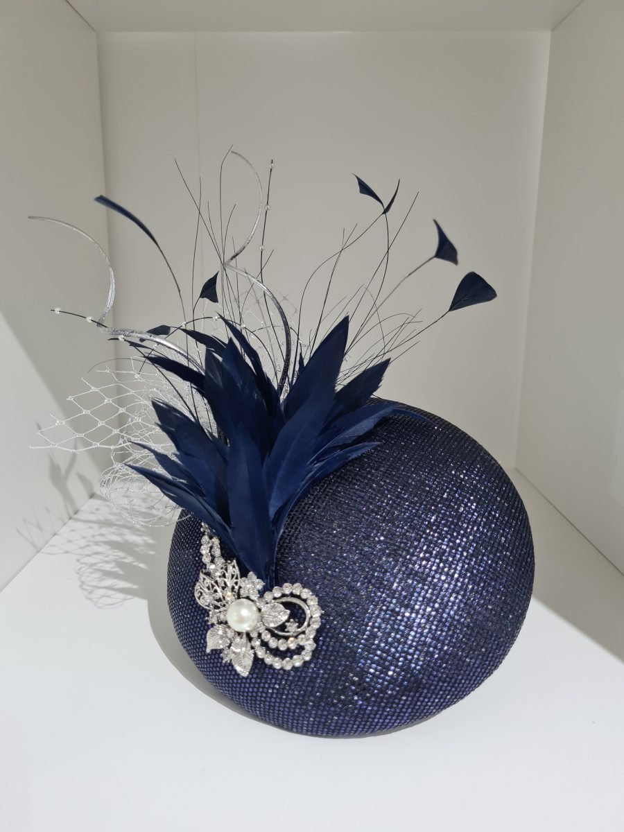 Metallic navy round pillbox with navy feather, silver quills, silver netting and pearl brooch detail.