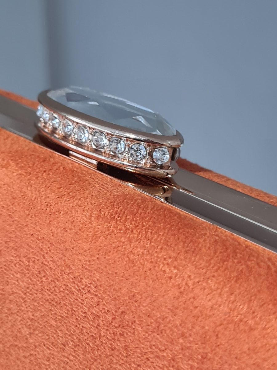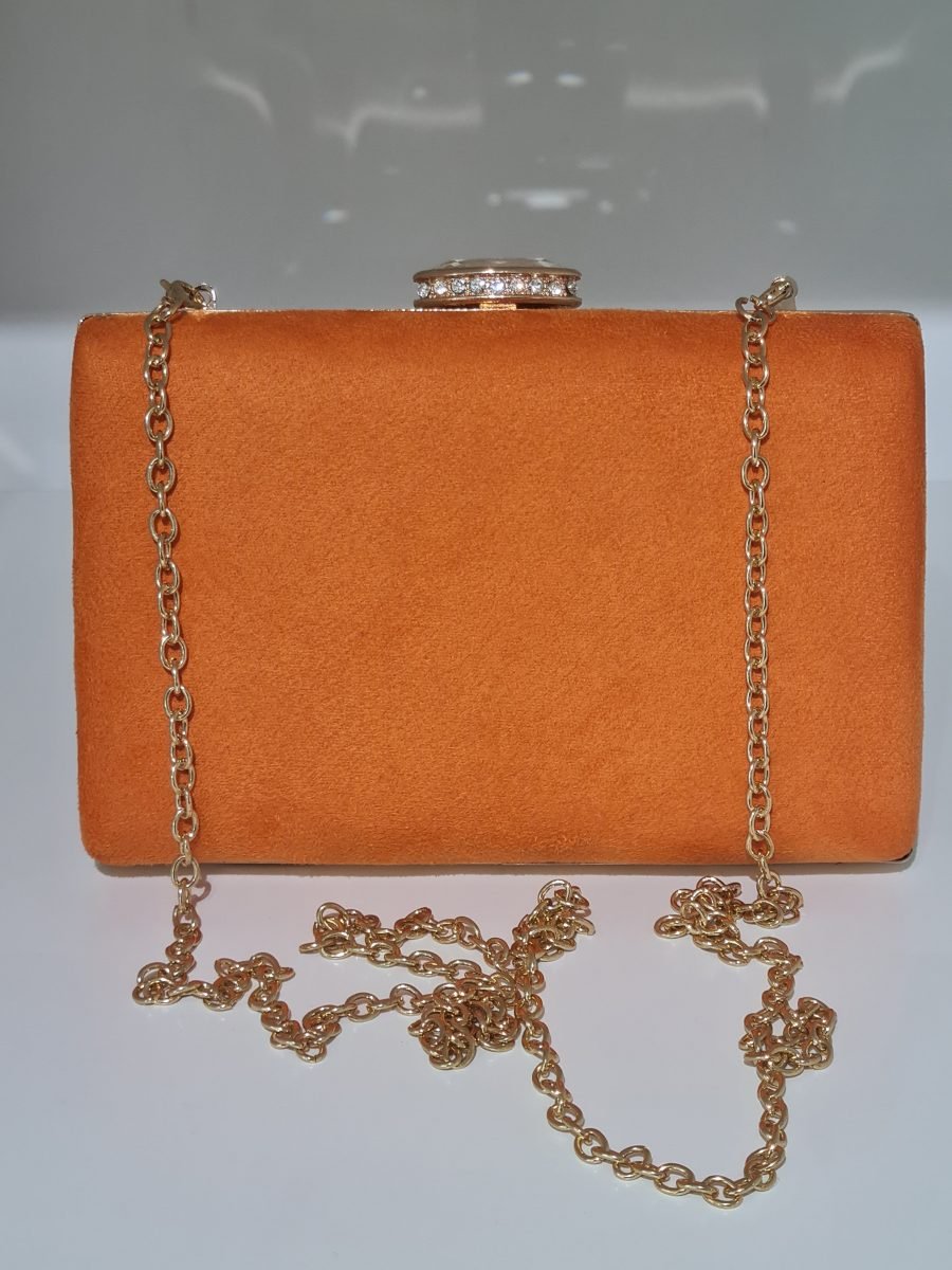 Orange suede effect evening bag with gold trim and removable shoulder chain strap
