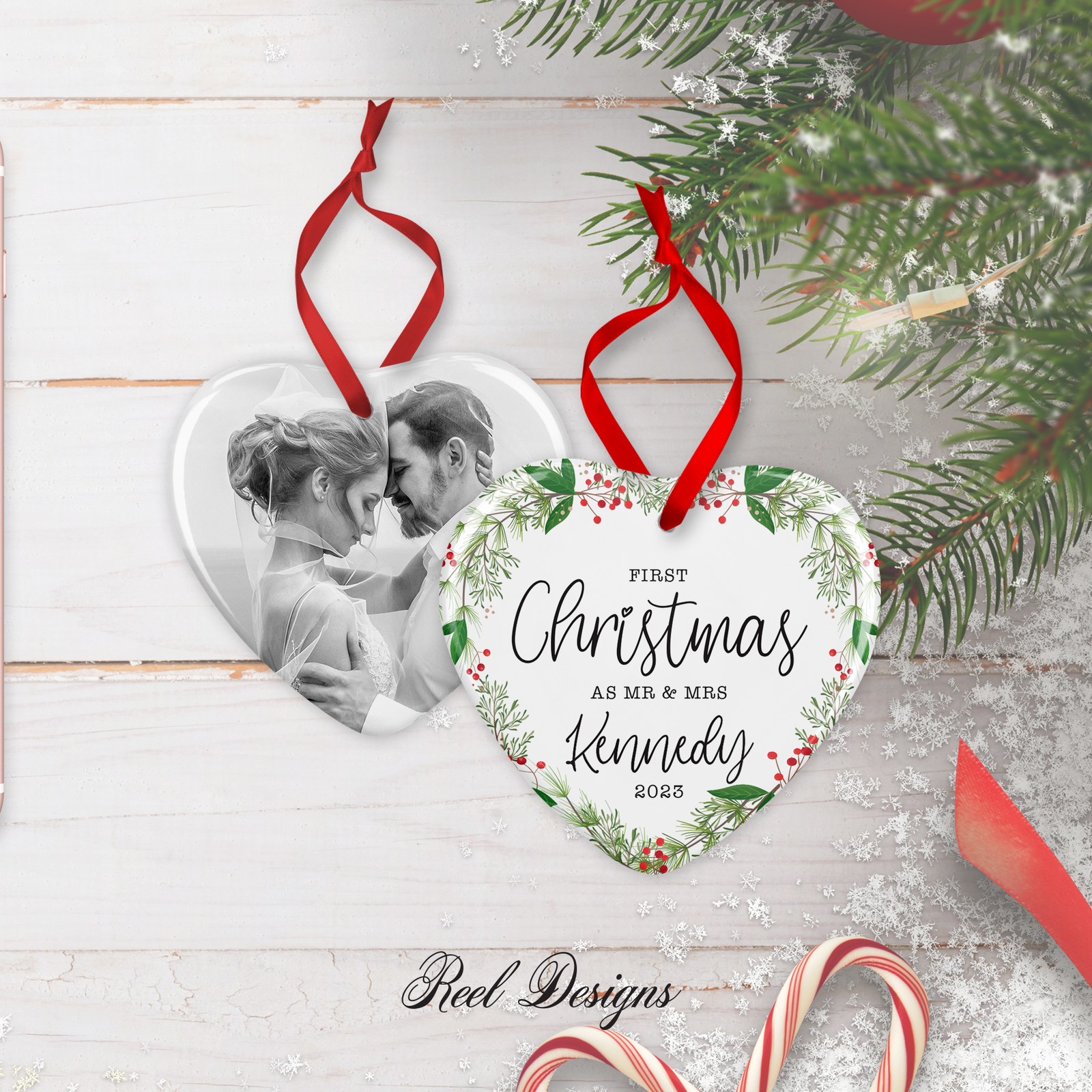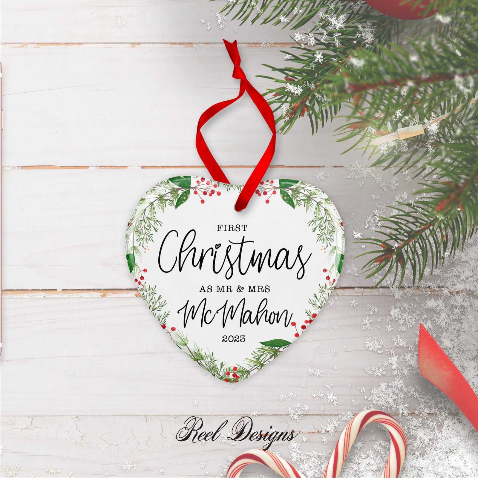 Personalised 2025 “First Christmas As…” Ceramic Love heart Ornament with holly print