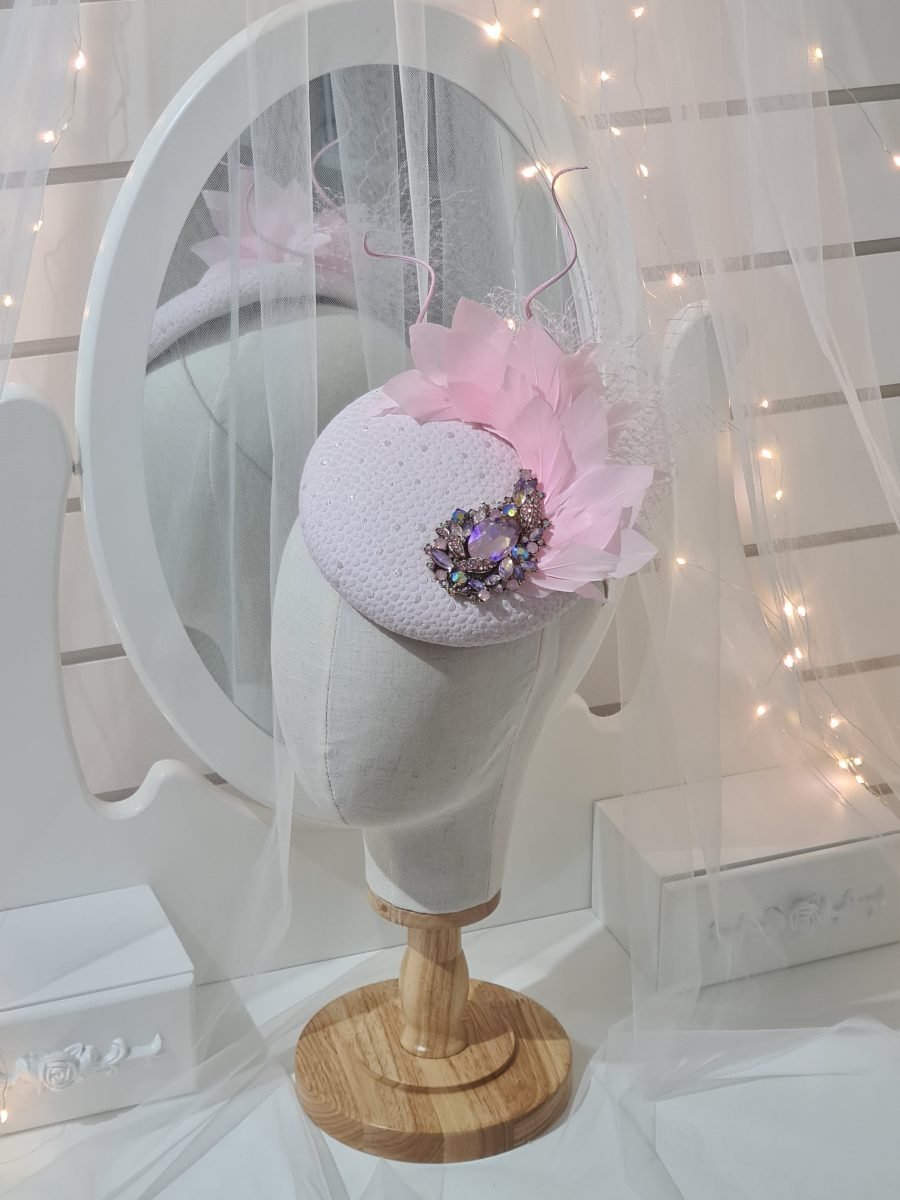 Pale/ Light / Baby pink round pillbox/ button headpiece with pink feather , pink quills and rhinestone brooch embellishment