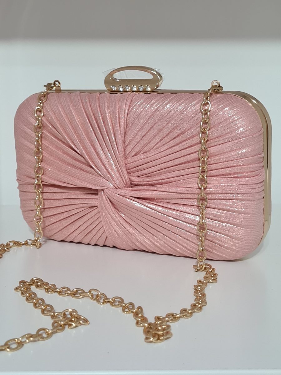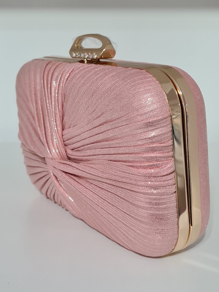 pink metallic pleated twist/ bow detail clutch bag with gold clasp and removable gold chain /shoulder strap