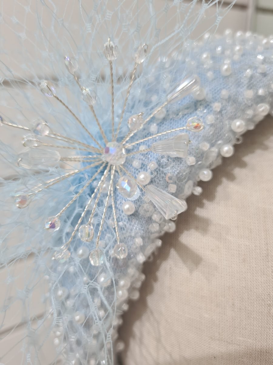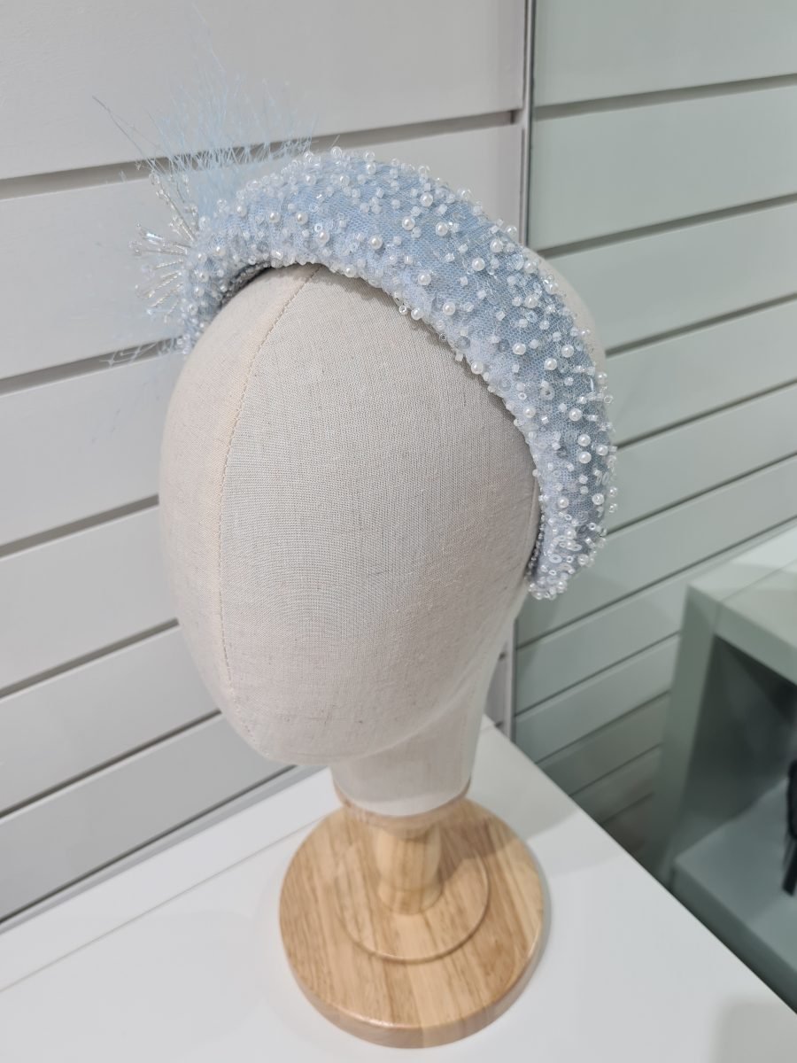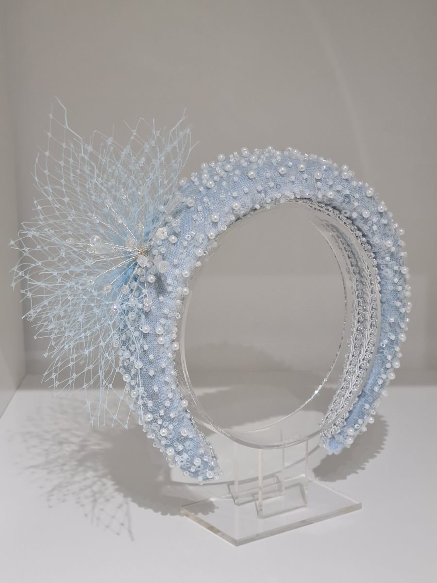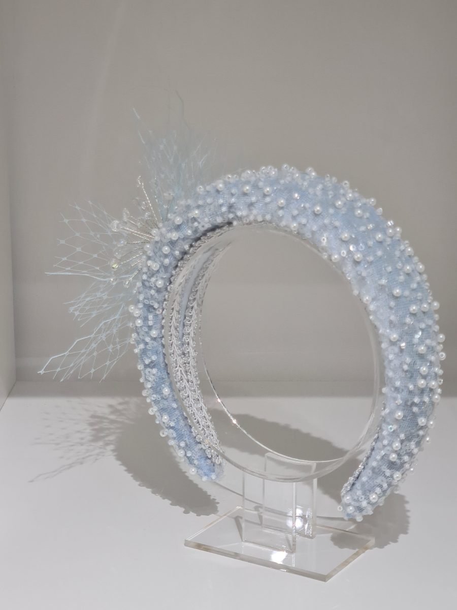 Powder blue padded headband with pearls and crystal bead embellishment, blue netting bow