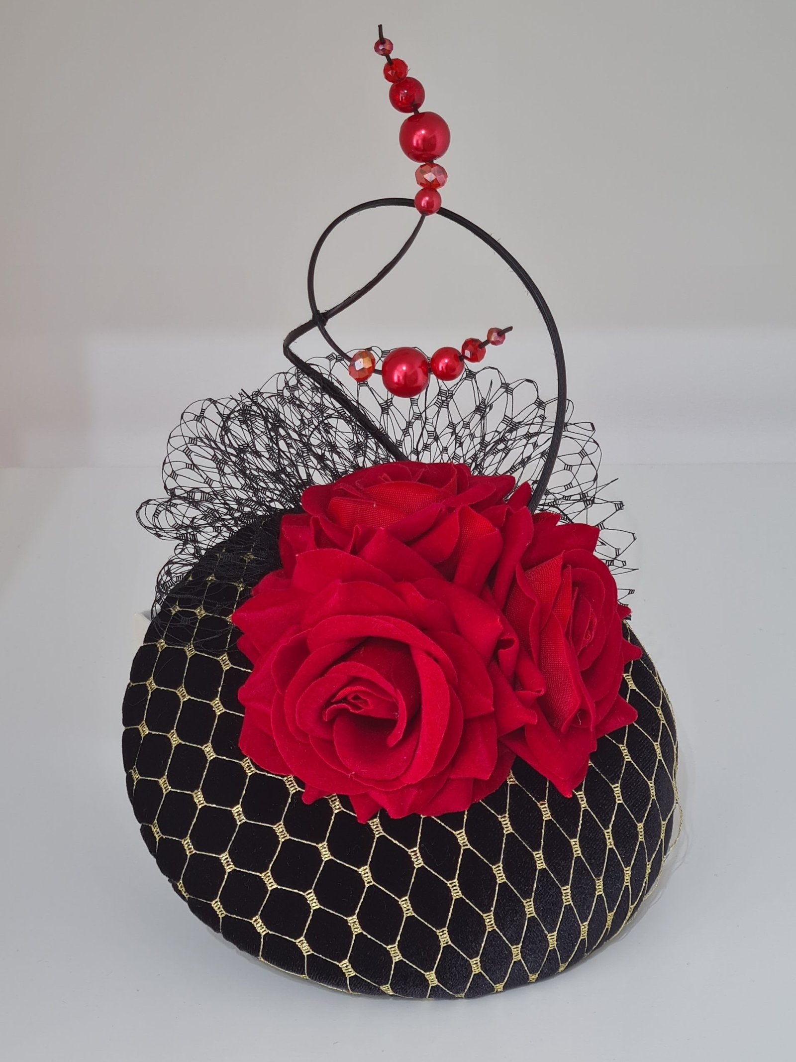 Button pillbox hat with red velvet roses, black quills with red pearls. Black velvet base covered with gold netting