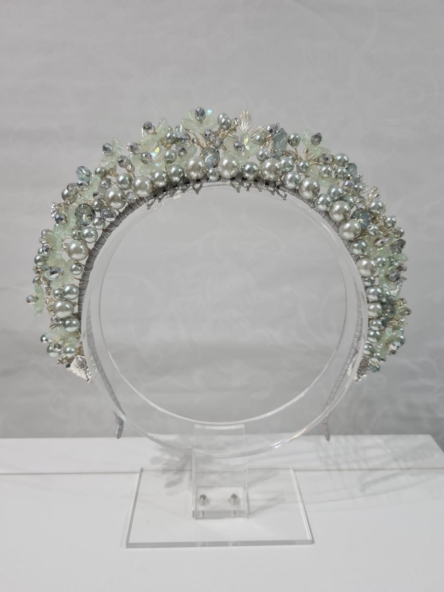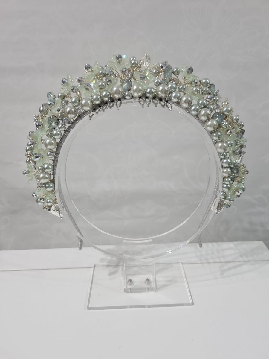 Sage green /silver pearl crown headband