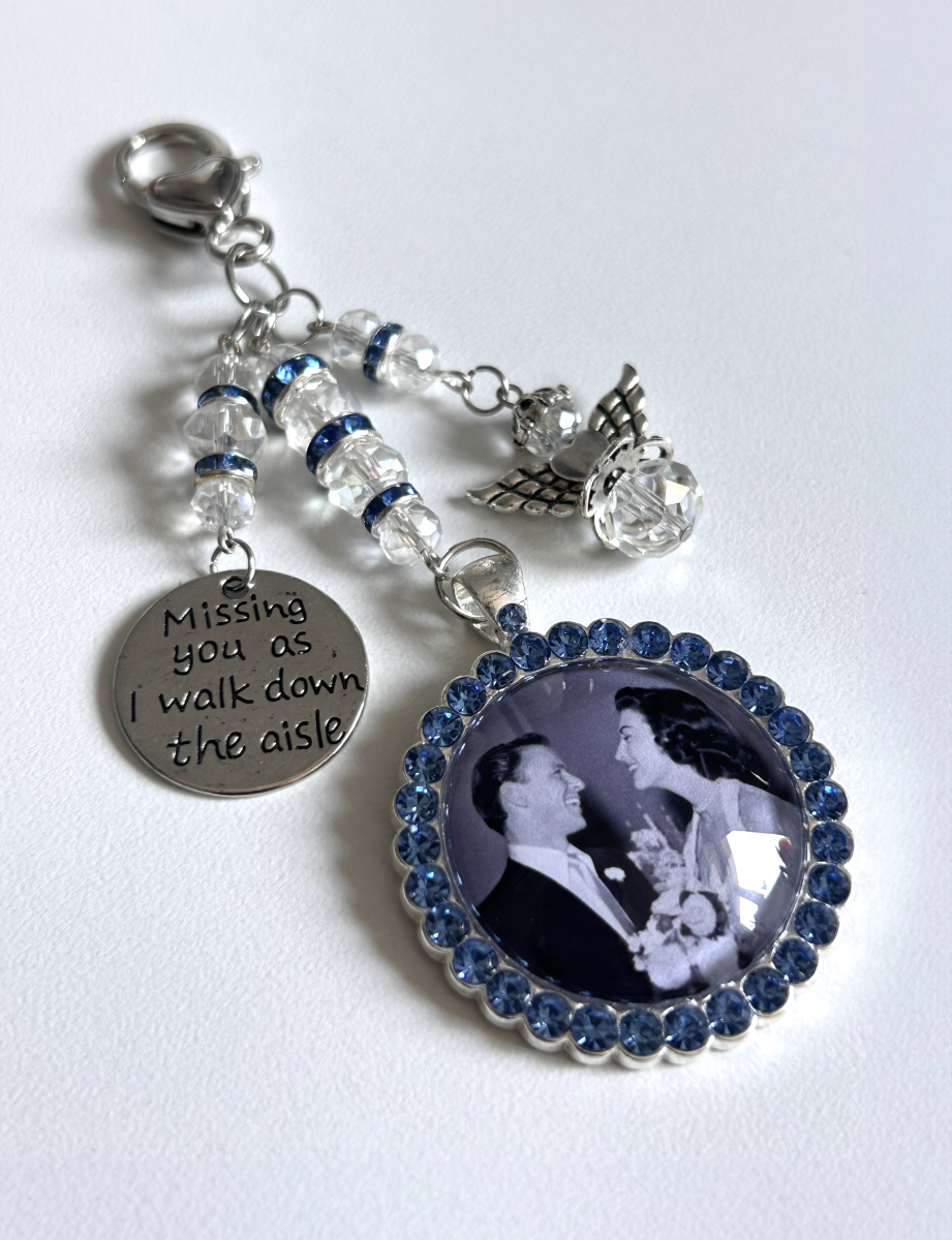 Incorporate loved ones who are no longer with you in your wedding with this beautiful blue rhinestone encrusted memorial wedding bouquet photo charm.