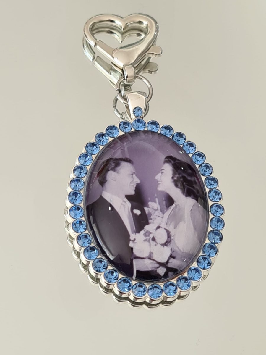 Incorporate loved ones who are no longer with you in your wedding with this beautiful blue rhinestone encrusted oval memorial wedding bouquet photo charm.