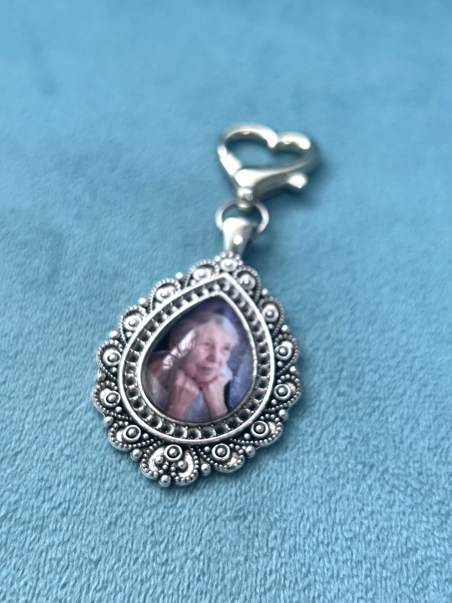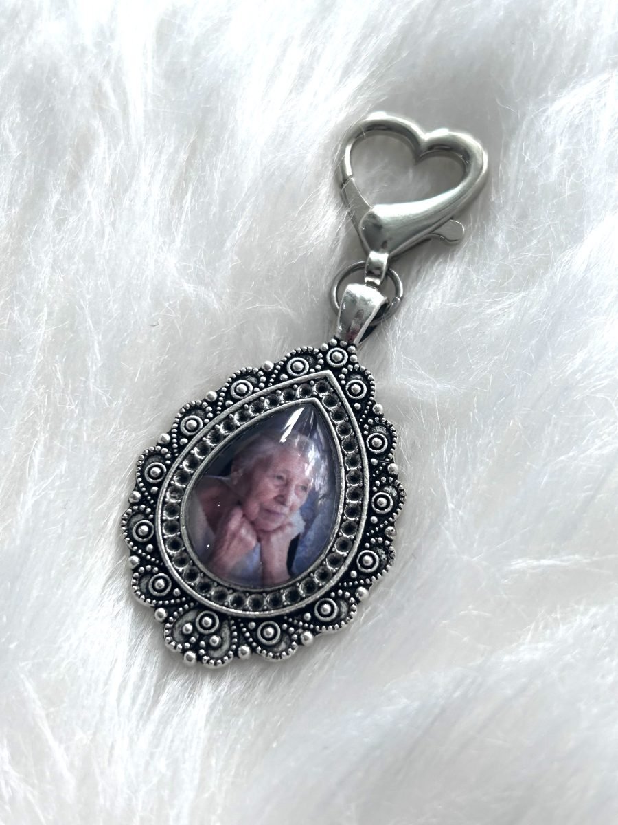 Incorporate loved ones who are no longer with you in your wedding with this beautiful teardrop memorial wedding bouquet photo charm.