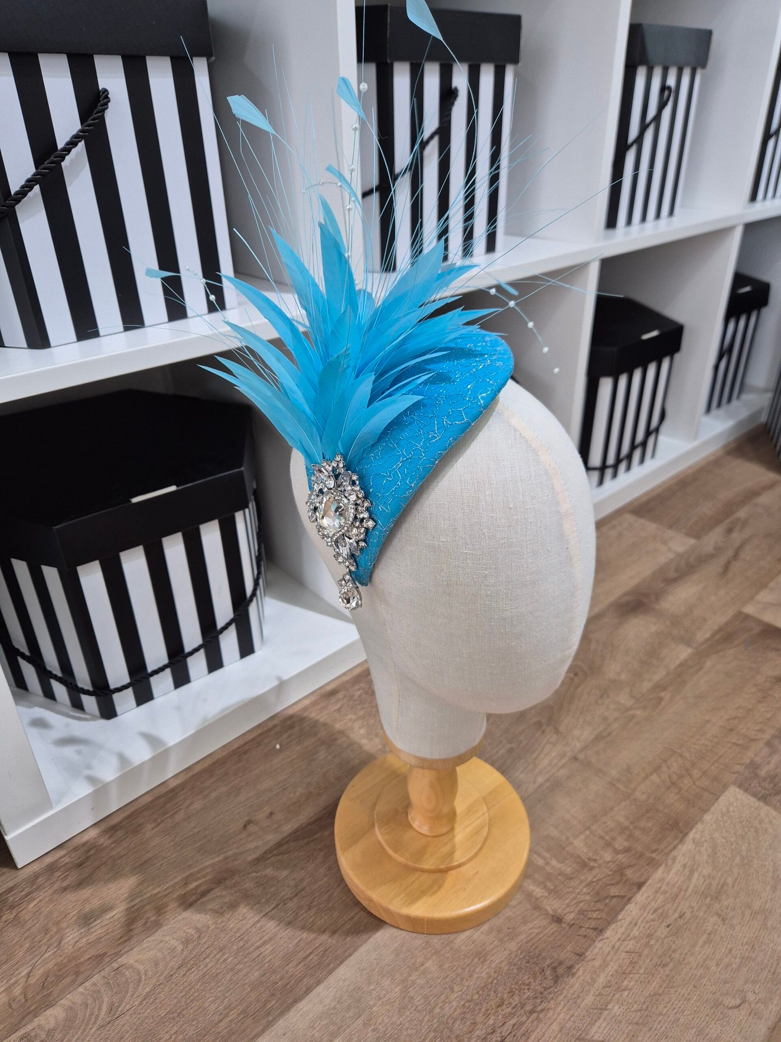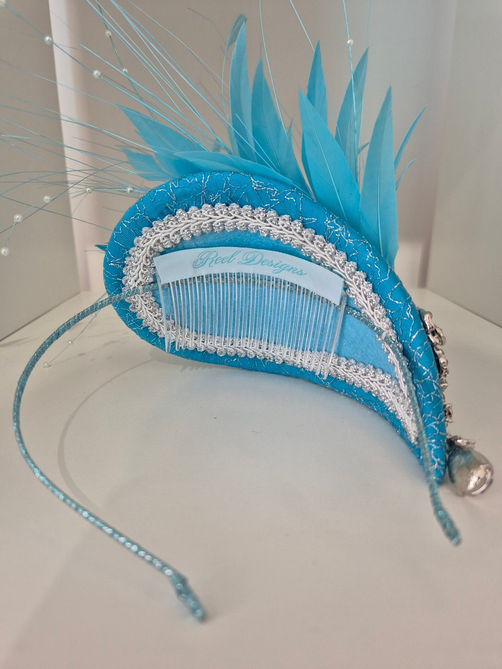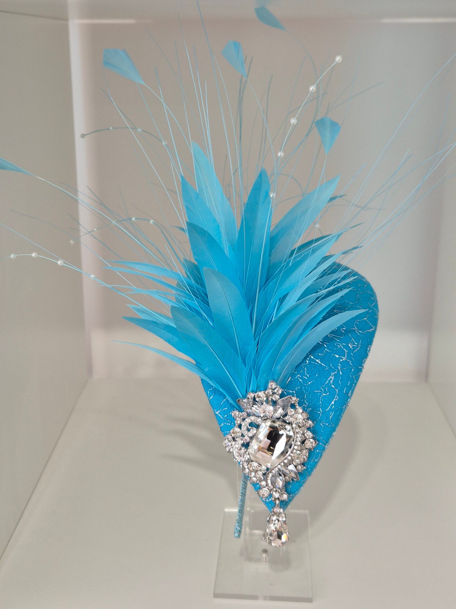 Turquoise blue headpiece with silver embellishment. Perfect finishing touch for Mother of the bride/groom outfit.