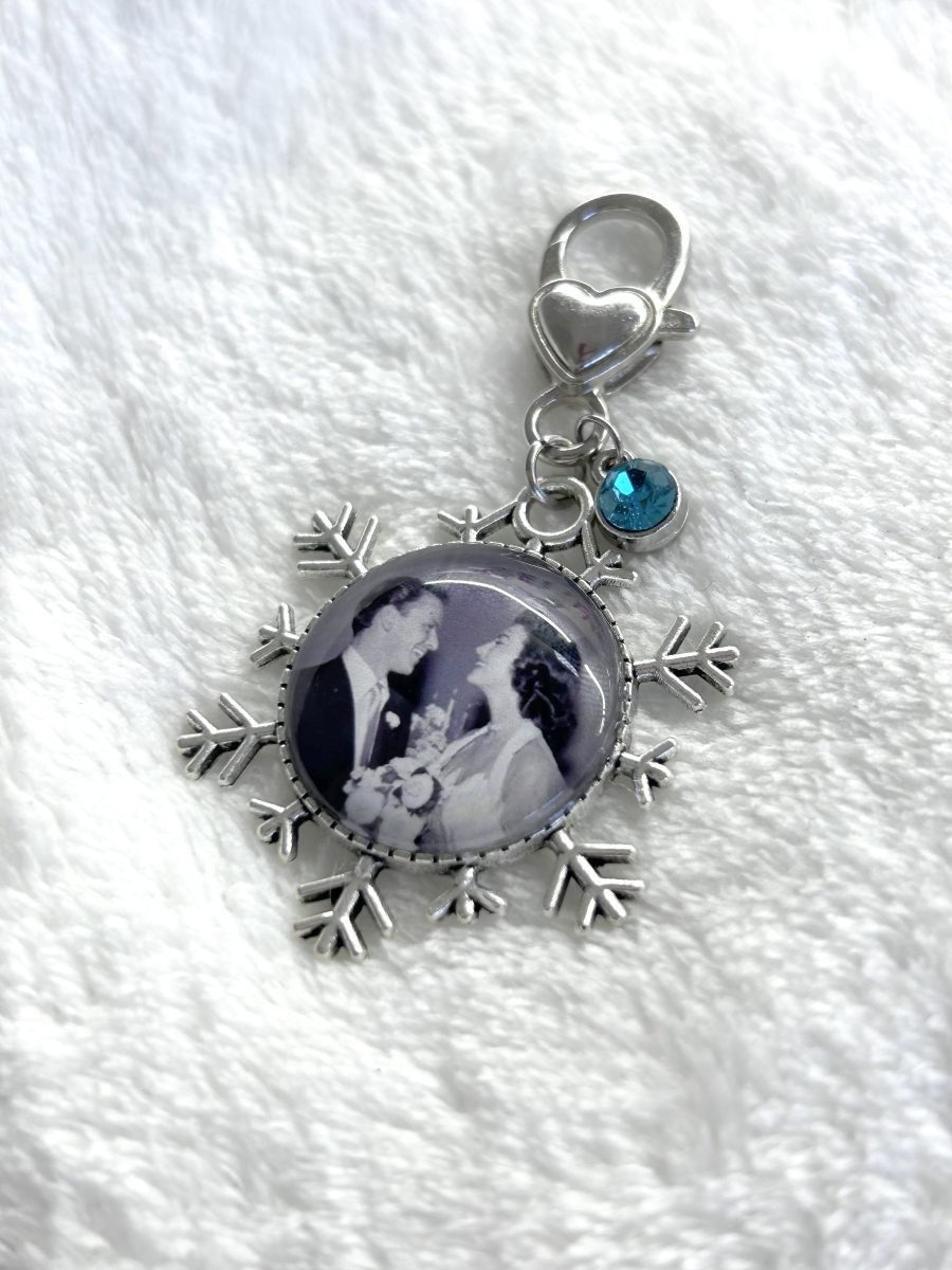Incorporate loved ones who are no longer with you into your winter wedding with this beautiful snowflake memorial charm personalised with a photo of your loved one.